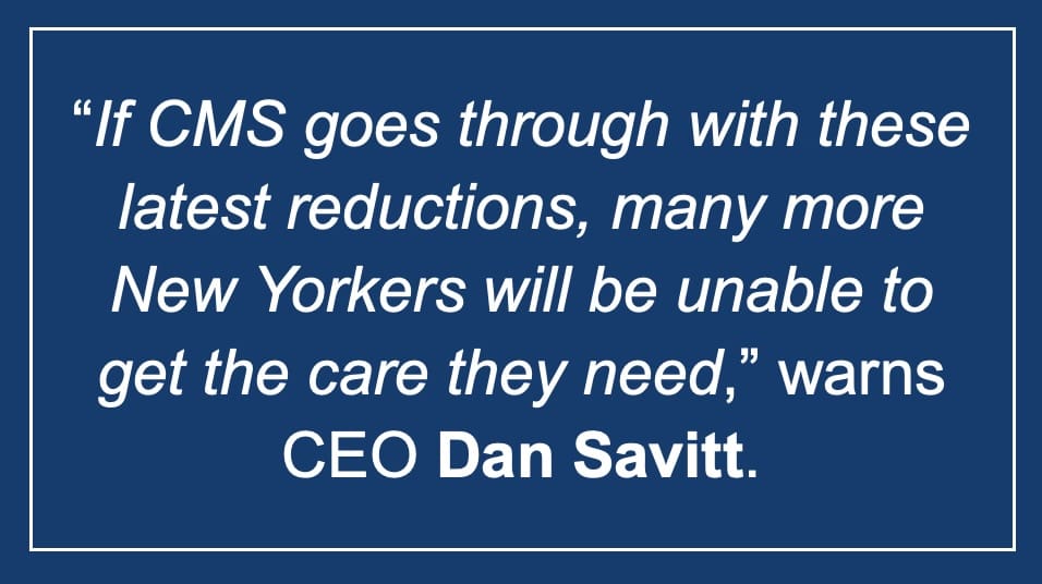 “If CMS goes through with these latest reductions, many more New Yorkers will be unable to get the care they need,” warns CEO Dan Savitt.