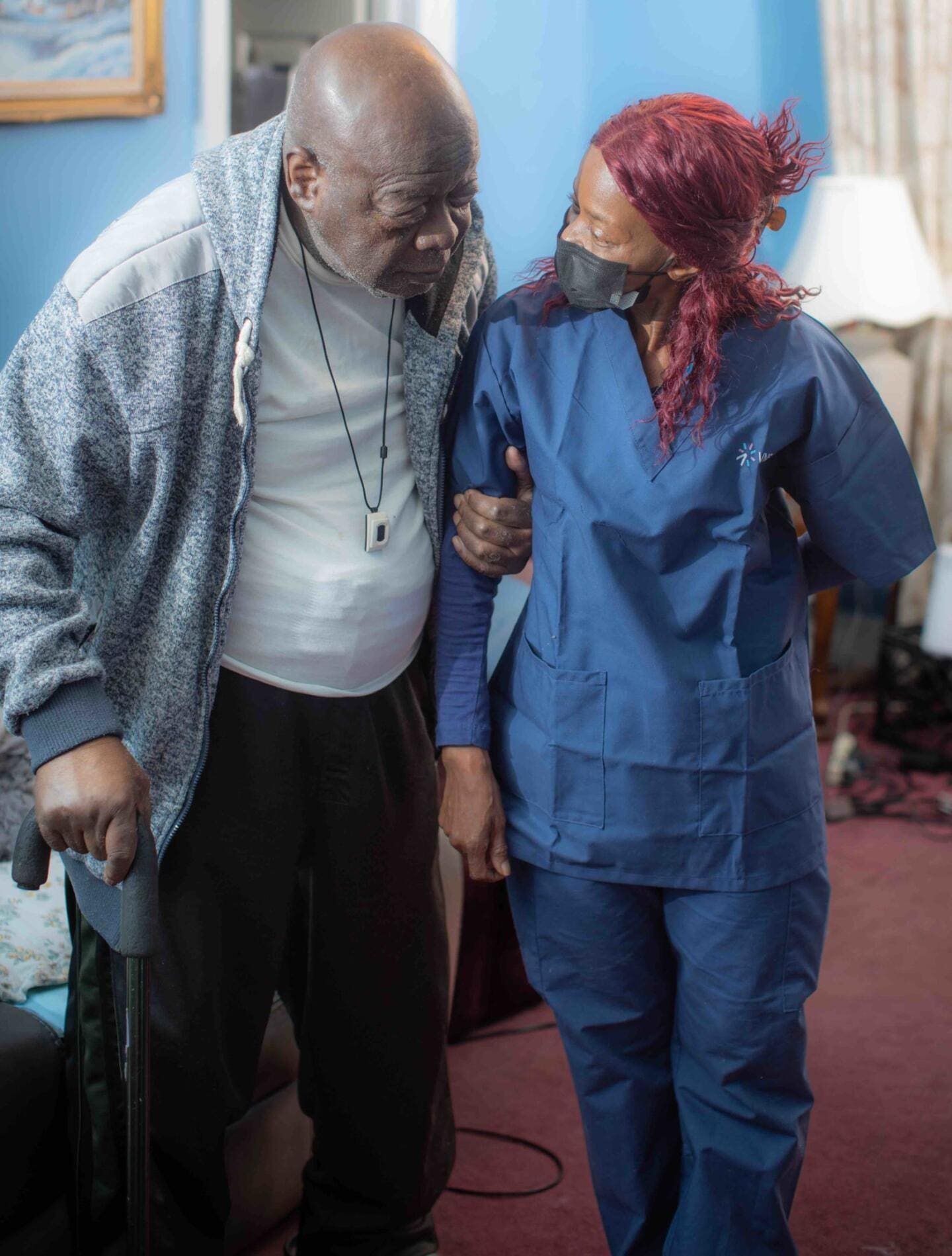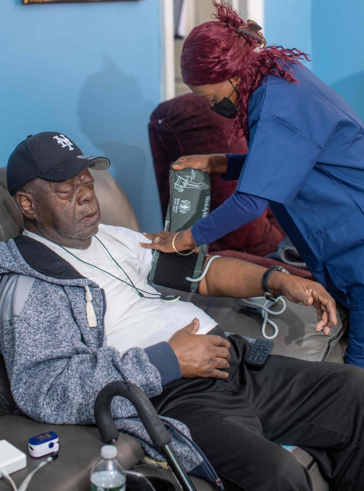 Like most patients who require live-in aides, Sebastian has intricate medical needs, including hypertension and edema. “First thing in the morning we take his blood pressure, weight, oxygen levels and temperature, then we wash him up and make breakfast,” says Jennifer. “He has foot and skin issues as well, so we apply special creams and lotions to his body. He takes his medications at specific times throughout the day, and we have to make sure he not only puts the meds in his mouth but swallows them.”