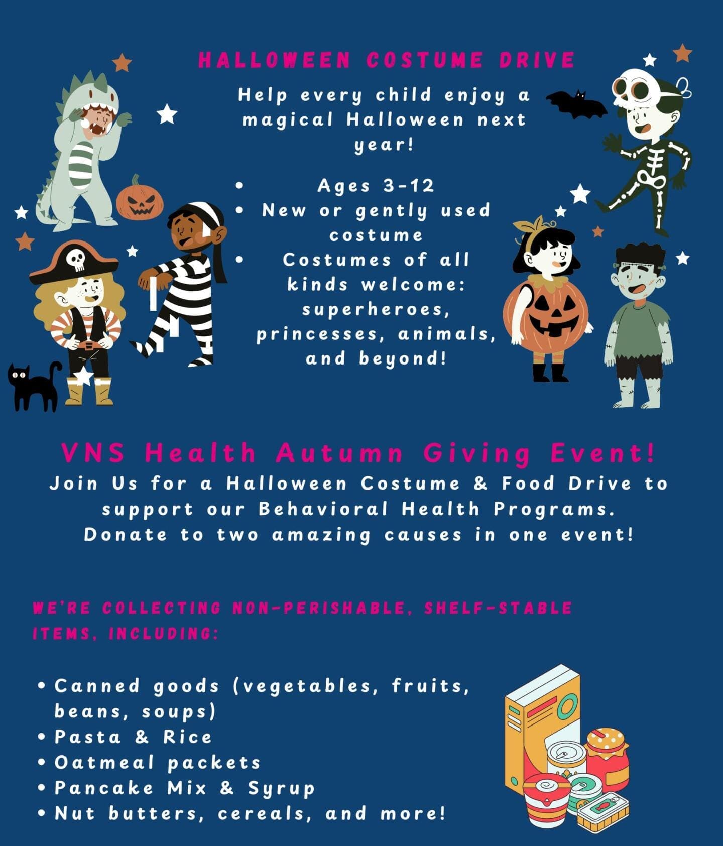 Join us for a Halloween costume and food drive to support our Behavioral Health programs. Donate to two amazing causes in one event!