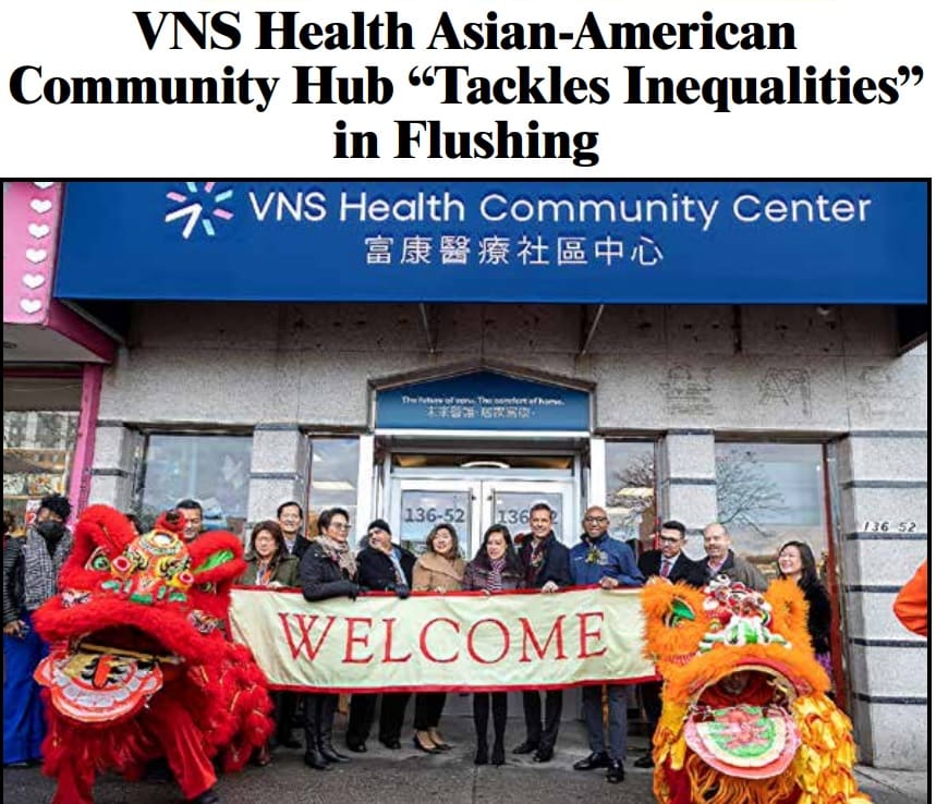 The grand opening of VNS Health’s new community center in Flushing, Queens was front page news in The Queens Times. The story, “VNS Health Asian-American Community Hub ‘Tackles Inequalities’in Flushing,” includes images of CEO and President Dan Savitt with distinguished event guests. In the piece, Dan shares why the opening is so important to VNS Health: “We are so proud to be deepening our connection here in Flushing. Our goal is to help simplify health care, make it easier to access, and meaningful for our neighbors in the community. We look forward to serving you in this great new community center.” Read the whole story on Frontline here.
